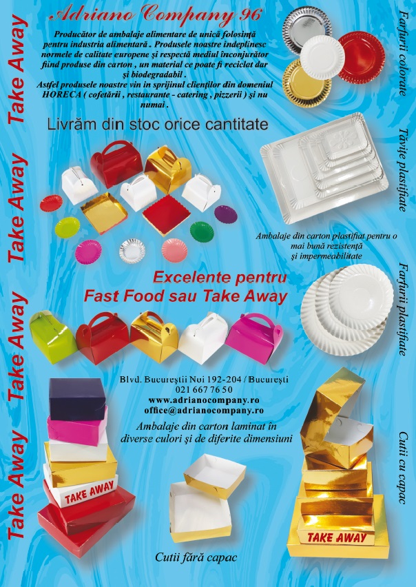 Utilizând materiale reciclabile dar și prietenoase cu mediul înconjurător, cum este cartonul duplex sau microondul, precum și hârtia, am reușit să creăm, ambalaje potrivite pentru toate necesitățile clienților noștri. Pornind de la tăvițe, farfurii din carton alb sau acoperite cu diferite folii colorate pentru o mai bună impermeabilitate sau cutii de torturi și prăjituri în diverse forme, dimensiuni și culori, cutii de pizza sau cutii destinate altor produse alimentare, am reușit să diversificăm gama de produse până în prezent la peste 200 de articole diferite. Toate produsele noastre sunt înregistrate ca marcă proprie la OSIM.