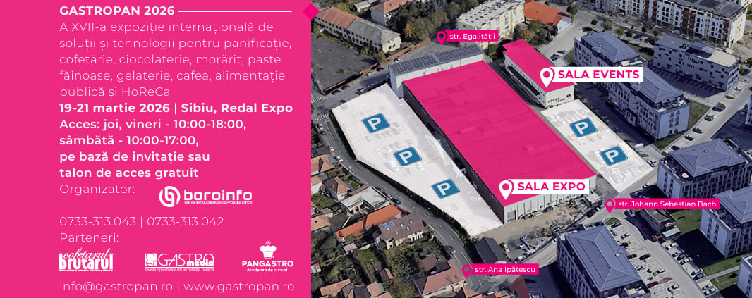 În perioada 19-21 martie 2026, orașul Sibiu va deveni centrul inovației și al tradiției în industriile de panificație, patiserie, cofetărie, gelaterie, ciocolaterie, cafea, morărit, pizza și HoReCa, prin intermediul expoziției internaționale GastroPan, care reprezintă astăzi punctul de referință pentru profesioniștii din aceste domenii. Cu o tradiție de 16 ediții consecutive, evenimentul reunește an de an furnizori de echipamente, materii prime și tehnologii de top cu specialiști, antreprenori și pasionați din industrie.