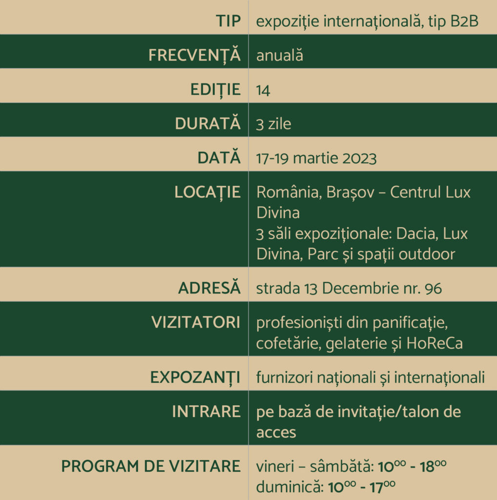 Este caracterizată ca fiind singura expoziție de specialitate de panificație, cofetărie și HoReCa organizată în România și una dintre cele mai mari din Europa de Sud-Est, cu peste 20 de ani de experiență în reunirea furnizorilor mondiali cu operatorii și producătorii de pe piață, cu 13 ediții consecutive marcate de prezența specialiștilor în fiecare an, peste o sută de furnizori din țară și străinătate care expun an de an, dar și peste 21.000 de vizitatori anual – dintre care vizitatori selectați (manageri, specialiști și cu putere de decizie – 82%).