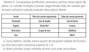 Pentru a testa această teorie, Puratos a efectuat un studiu intern expert de tip panel – un test descriptiv senzorial pentru pâinea din multiple cereale germinate în comparație cu pâinea din multiple cereale negerminate. Cele două tipuri de pâine au fost prezentate unui grup de opt experți pentru evaluarea produselor. Membrii grupului de experți au primit o listă cu 17 descriptori de aromă și li s-a solicitat să selecteze descriptorii pe care îi puteau percepe în fiecare pâine. Descriptorii finali pentru fiecare tip de pâine au fost aceia pentru care exista un consens între membrii grupului de experți: note primare care au fost selectate de cel puțin șase membri; note secundare care au fost selectate de cel puțin trei membri. Tipul de pâine de control (cereale și leguminoase negerminate) a fost descris ca având o aromă de malț și drojdie, cu gust de nuci cu note de plante, în timp ce pâinea făcută din cereale și leguminoase germinate a fost descrisă ca având note naturale dulci, de malț, fermentate, cu gust de fructe și de prăjit (Tabelul II).