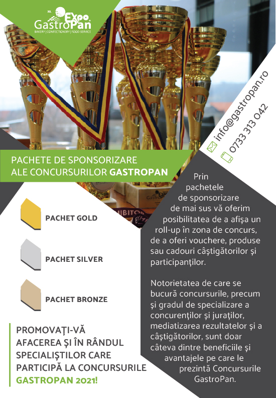 Organizatorii expoziției GastroPan și ai Concursurilor GastroPan oferă companiilor furnizoare de servicii și produse dedicate panificației, cofetăriei și gastonomiei posibilitatea de a deveni parteneri ai celor trei secțiuni de concurs: PANIFICAȚIE-PATISERIE, COFETĂRIE și GASTRONOMIE. Companiile interesate pot accesa unul dintre cele trei variante de sponsorizare disponibile, beneficiind de o excelentă promovare în rândul concurenților, juriului, vizitatorilor și expozanților.
