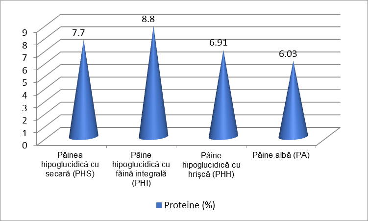 Prin compararea datelor nutriționale ale celor 3 produse analizate (figura 1) se observă că, raportând la 100 g produs, conținutul proteic cel mai ridicat se regăsește în pâinea integrală PHI (8,8%) urmat de PHS (7,7%), PHH (6,91%) si PA (6.03%). Se observă un aport suplimentar proteic furnizat de făina integrală de grâu, în timp ce pâinea din făină albă conferă produsului cel mai scăzut conținut proteic.