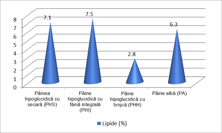 Fracția lipidică în PHS este de 7,1%, comparabil cu al PHI (7,5%) și este datorată uleiului de măsline și semințelor adăugate. Pâinea cu făină de hrișcă (PHH) prezintă cel mai scăzut conținut lipidic (2,8%) fiind indicat într-o dietă hipocolesterolemiantă.