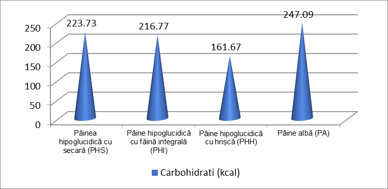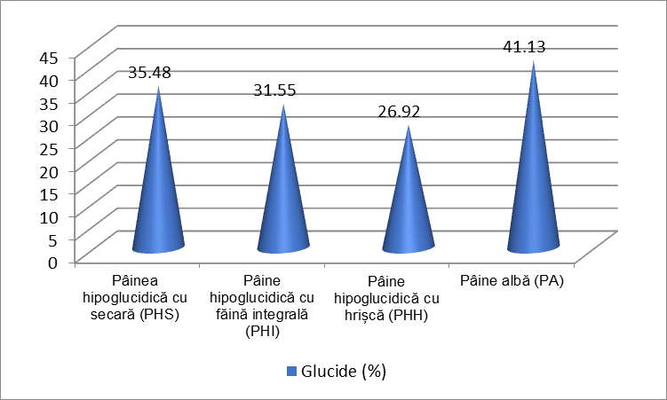 Glucidele din compoziție se datorează amidonului hidrolizat din cereale. Se remarcă aportul glucidic maxim în cazul pâinii albe (41,13%) urmat de pâinea cu secară (35,48%), pâinea cu făină integrală PHI (31,55%) și pâinea cu hrișcă PHH (26,92%).