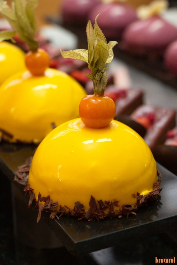 Formele se umple cu cremă. În centru se pune jeleul congelat. Se pune la congelator cu şoc termic. Se scot deserturile din forme şi se aplică o cuvertură. Se decorează.