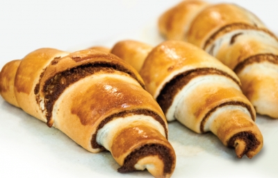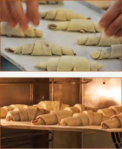 După un repaus de 25 minute, aluatul se împarte în două bucăți egale și se întinde manual în formă dreptunghiulară. Se aplică jumătate din umplutură pe partea inferioară a aluatului dreptunghiular, apoi se împătură prin suprapunerea părții superioare, și se întinde împreună cu umplutura. (Notă: aluatul nu trebuie să aibă o consistență foarte moale, pentru a se putea întinde cu ușurință, iar dacă umplutura se înmoaie prea tare în timpul amestecării, trebuie pusă la frigider pentru a se întări). Aluatul umplut se întinde astfel încât să fie de cca. 30 cm înălțime, iar lățimea cât permite decuparea. Micile triunghiuri se rulează, se ung cu ouă, apoi se lasă la dospit timp de 25 de minute, după care se coc la o temperatură de 180°C.