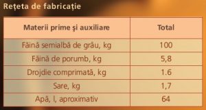În cuva malaxorului se introduc 50% din făina de grâu, făina de porumb, suspensia de drojdie, soluţia de sare, 50% din apă şi se frământă 3-4 minute. În timp ce se frământă se adaugă şi restul de apă şi făină şi se mai frământă 7-8 minute. Se lasă aluatul la fermentat la temperatura de 32-33°C, timp de 110-120 minute. Aciditatea finală este de 3,5-4 grade. Aluatul fermentat se divizează în bucăţi de 1,130 sau 1,660 kg pentru pâinea coaptă de 1,0 sau 1,5 kg bucata şi se lasă la dospirea finală la temperatura de 32..33°C, timp de 35-40 minute. După dospirea finală bucăţile de aluat se spoiesc cu apă, se crestează sau se înţeapă şi se introduc în cuptor pentru coacere.
